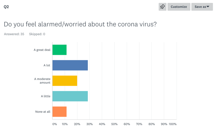 - My second question was: “Do you feel alarmed/worried about the corona virus?” The most popular response was tied between “a lot” and “a little” at 28.57% for each. The second biggest response (20%) was saying a moderate amount. Tied for the least responses at 11.43% was “a great deal” and “none at all”.