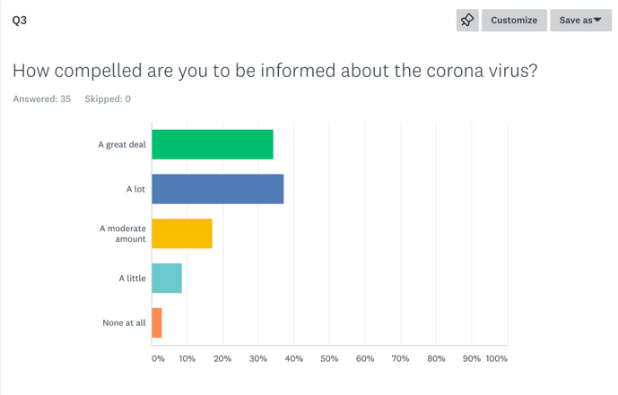 - My third question was: How compelled are you to be informed about the corona virus? Respondents seemed generally very compelled to learn more about the corona virus based on the responses to this question. 37.14% of respondents answered that they were compelled “a lot” to be more informed and 34.29% of respondents were compelled “a great deal”. 17.14% of respondents answered they were compelled to be informed a moderate amount, 8.57% answered “a little”, and only 2.68% (1 person) said “not at all”.