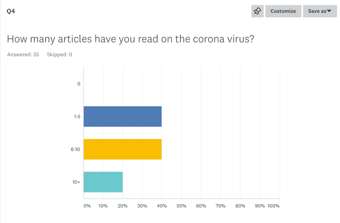 - My fourth question asked, “How many articles have you read on the corona virus?” Everyone that I surveyed had done research on their own because no one answered 0. Tied at 40%, was people answering “1-5” and “6-10”. 20% said more than 10 articles.