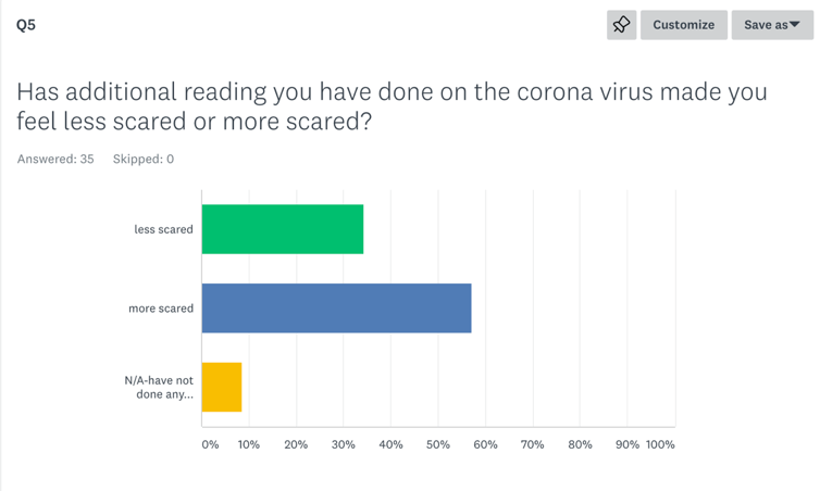 - My fifth question was, “Has additional reading you have done on the corona virus made you feel less scared or more scared?” The majority of people answered that additional reading made them more scared (57.14%). 34.29% of respondents said that they were less scared. 8.57% said this question did not apple, that they felt neither way.