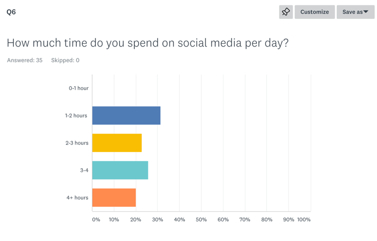 - My sixth question asked respondents, “How much time do you spend on social media per day. Most people answered that they spend 1-2 hours (31.43%). The next most popular answer was 3-4 hours (25.71%). 22.86% of respondents answered 3-4 hours, and 20% of respondents said 4+ hours. No respondents answered that they used 0-1 hour of social media.