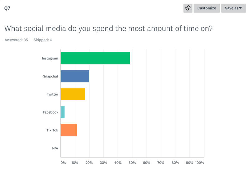 - My next question asked, “What social media do you spend the most amount of time on?” Instagram by far was the most popular, with 48.57%. Next was snapchat, with 20%, next was Twitter with 17.14%, next was Tik Tok, with 11.43%, and the minority (2.86%) chose Facebook.