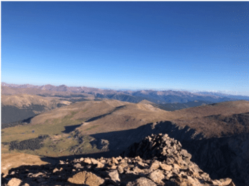 We get to the lot, and the sun is just starting to peek above the tree line, a blood orange wave hovering over us. We get out of the car and throw our coffee cups away, before starting in on the ramp. These grasses reached up above my waist and there was a ramp made from shambled wood planks indicating the trailhead. It was an exhilarating feeling to know we were the first hikers and we were alone. The trail started off flat and windy; we were approaching the mountain ahead of us. The orange glow now enveloped us, granting us trespass to the mountain before us. Madeleine is a fellow teammate, and an insane athlete. She has done over 25 14ers in Colorado, and this was only my first. I am pushing to keep up with her because she is practically sprinting. We begin our gradual incline. The terrain starts to change from those dancing high grasses to shorter rougher blanket, more and more rocks littering the trail. At this point, I’m still keeping up with her for the most part.